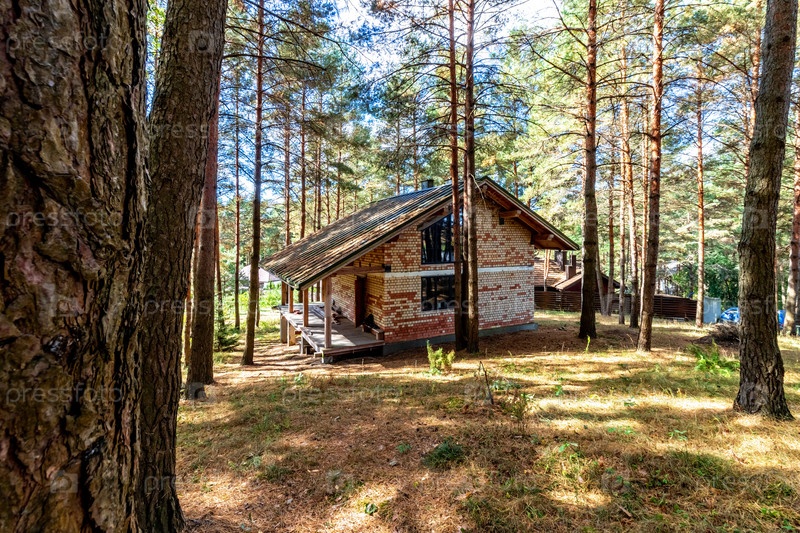 Строящийся дом в сосновом лесу в солнечный осенний день