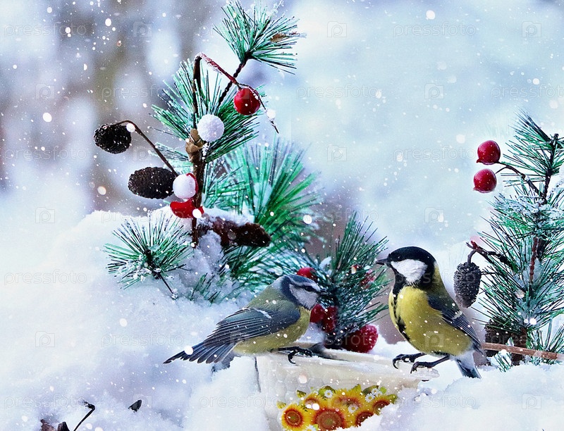 Русская природа зимой, рождественский фон, птица-синица клюет семена. Это красивый зимний баннер, новогодняя открытка, избирательный фокус