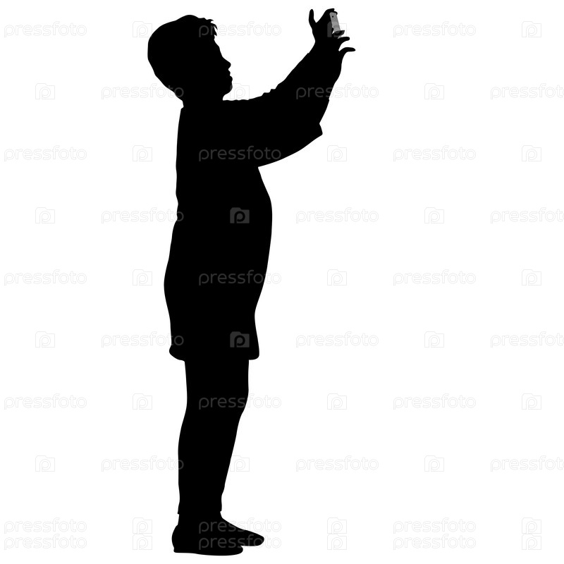 Силуэты женщины, делающей селфи со смартфоном на белом фоне