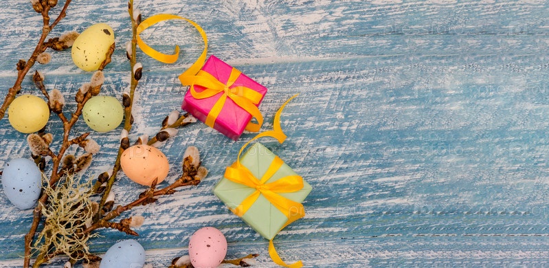 Подарочные коробки с лентами. Пасхальные яйца. Веточки ивы. Святая Пасха. Синий бирюзовый фон
