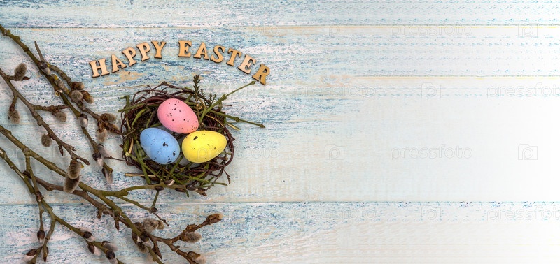 Христос воскрес. Веточки ивы. Святая Пасха. Синий бирюзовый фон. Пасхальные яйца в гнезде