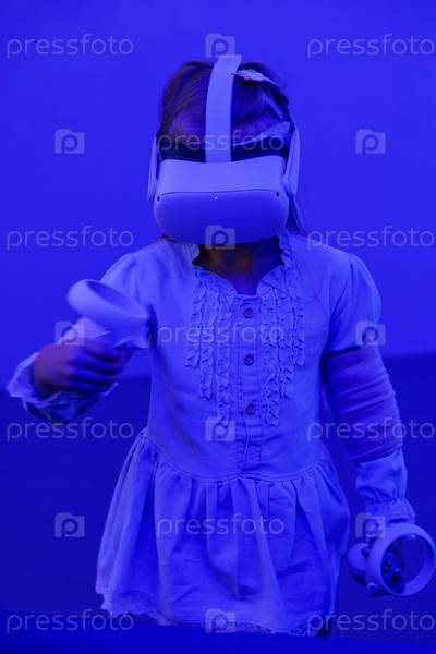 Девушка в виртуальных очках на голове ходит по комнате, залитой неоновым светом. Фото высокого качества