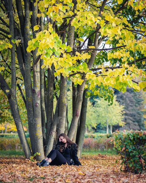Красивая девушка сидит у дерева на опавших листьях в осеннем парке