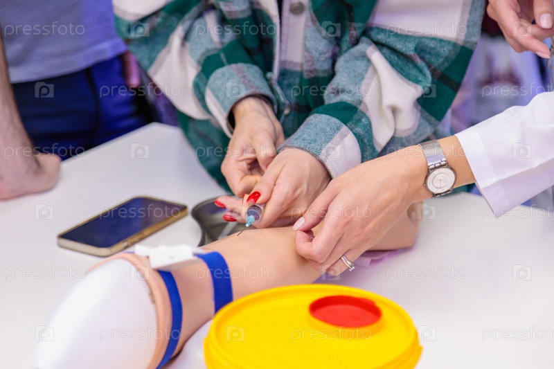 Обучение забору крови из вены, на модели руки человека. Фото высокого качества