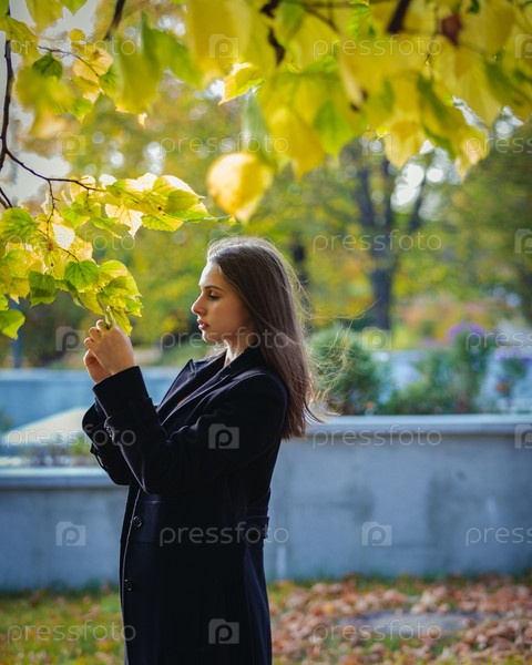 Красивая девушка смотрит на желтые листья на ветке в осеннем парке