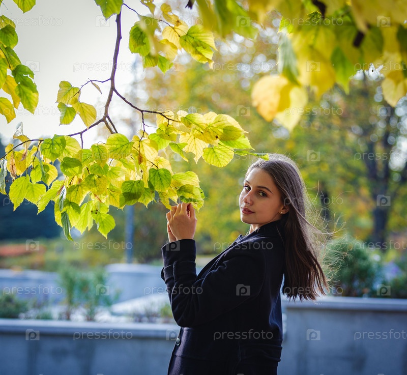 Красивая девушка смотрит на желтые листья на ветке в осеннем парке