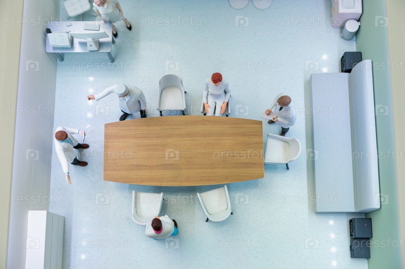 План большой городской поликлиники, модели помещений с оборудованием и людьми. Фото высокого качества