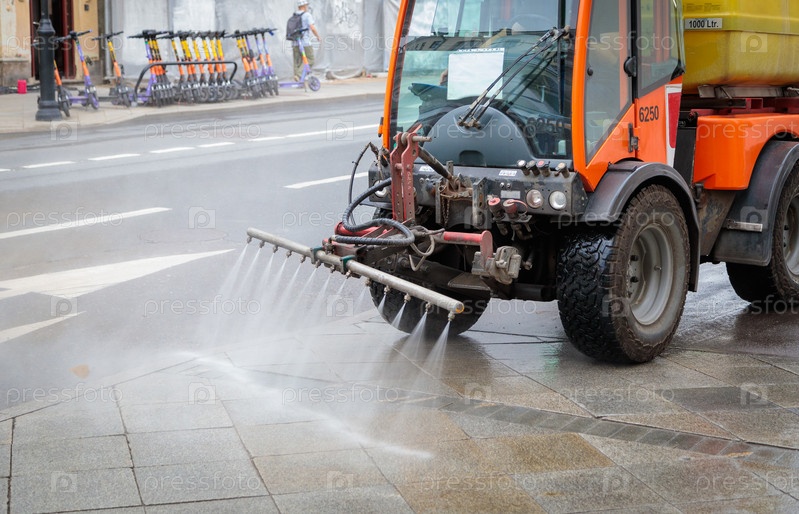 Подметальная машина увлажняет тротуар в жару. Фото высокого качества