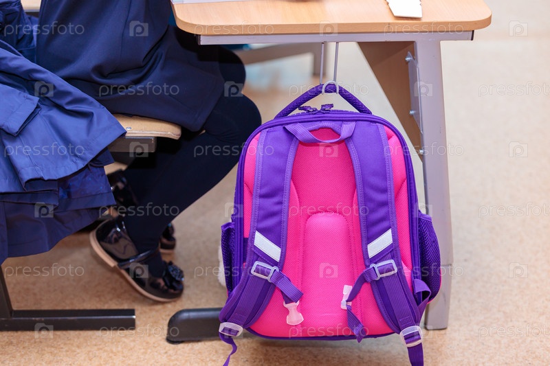 Школьный рюкзак висит на крючке на столе, где сидит ученик