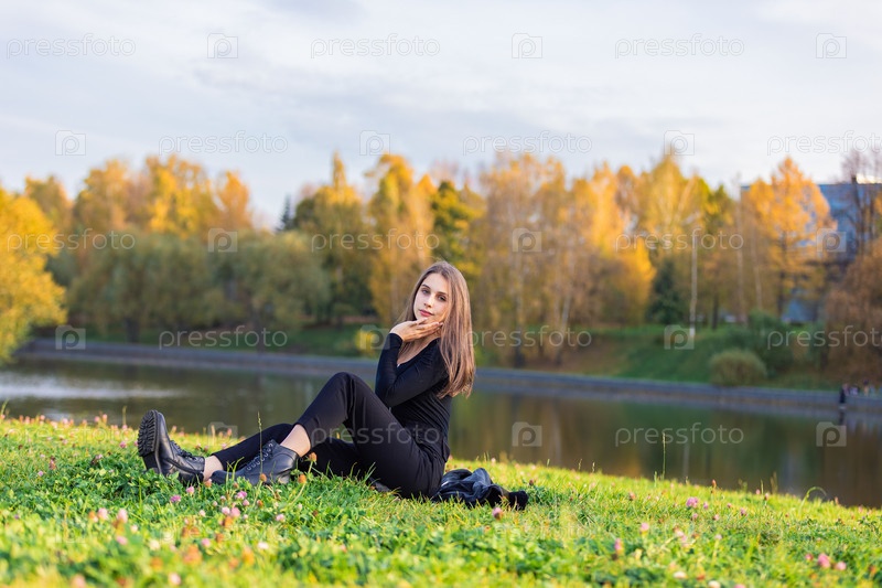 Красивая девушка позирует, сидя на траве у пруда в осеннем парке