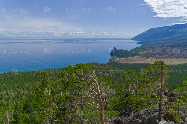 Вид на берег озера Байкал со склона прибрежной горы. Иркутская область, Россия. Август