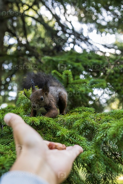 Белка в парке ест орехи с руки