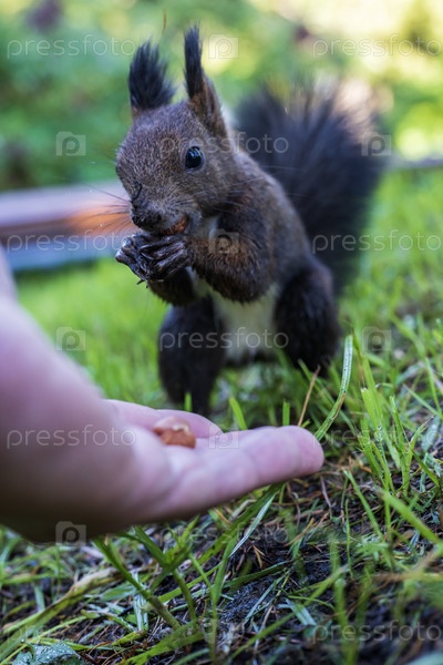 Белка в парке ест орехи с руки
