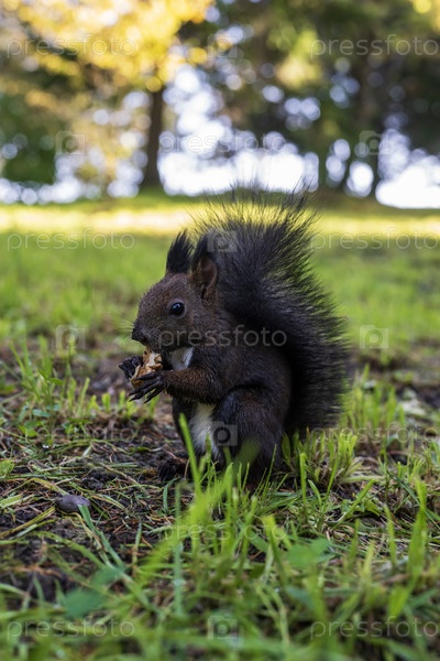 Белка в парке ест орехи