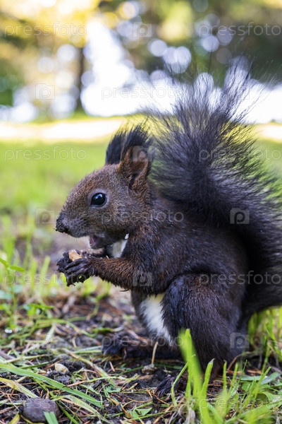 Белка в парке ест орехи