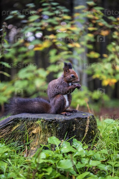 Белка в парке ест орехи