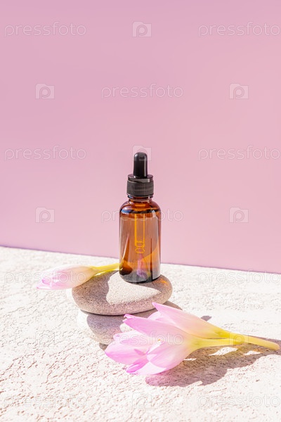 Натуральный косметический продукт в коричневой стеклянной бутылке с пипеткой стоит на подиуме из серых овальных камней. натуральная косметика. Органический уход