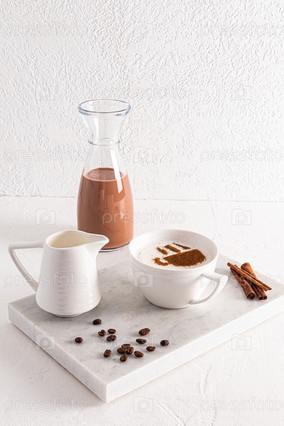 Большая белая чашка вкусного ароматного кофе капучино на белом мраморном подносе с палочками корицы и кофейными зернами. Вертикальный вид