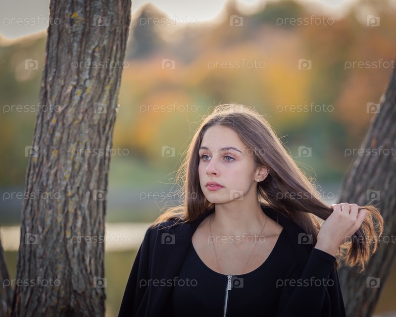 Красивая девушка позирует, стоя у пруда в осеннем парке