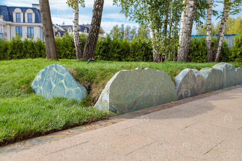 Благоустройство территории, окантовка дорожки валунами из камня диабаза