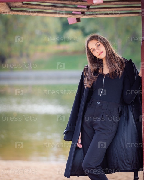 Красивая девушка позирует, стоя у пруда под зонтиком в осеннем парке