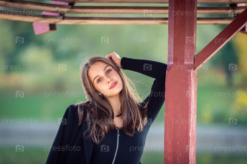 Красивая девушка позирует, стоя у пруда под зонтиком в осеннем парке