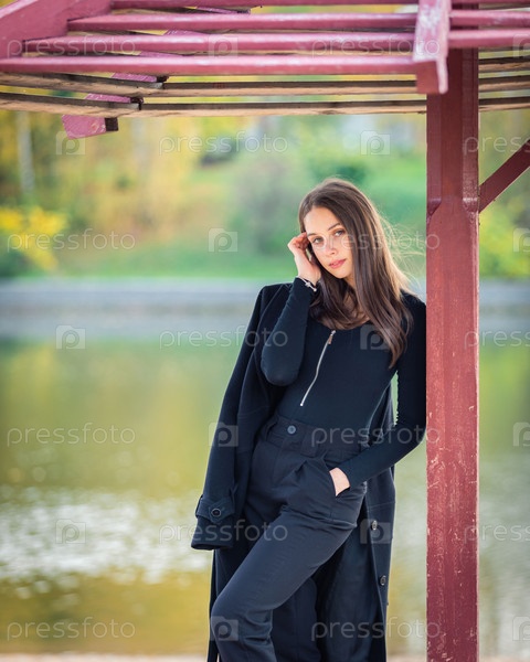 Красивая девушка позирует, стоя у пруда под зонтиком в осеннем парке