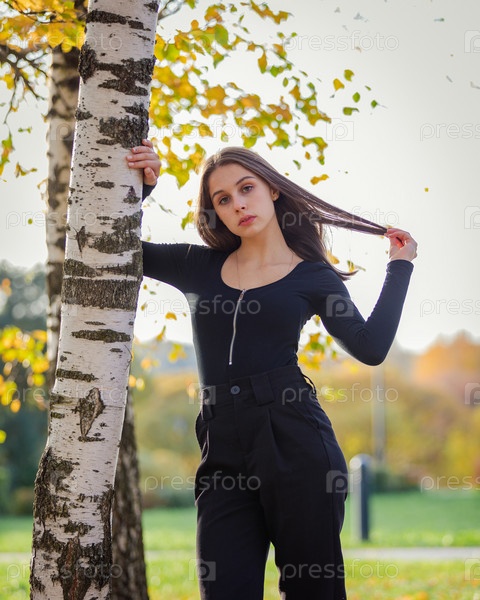Красивая девушка позирует возле березы в осеннем парке