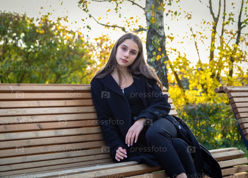 Красивая девушка позирует на скамейке в осеннем парке