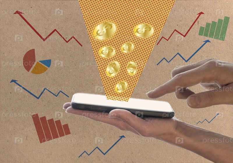 Женские руки держат смартфон на фоне диаграмм роста и диаграмм в стиле ретро. Концепция электронной коммерции и интернет-инвестиций. Коллаж современного искусства, современный дизайн