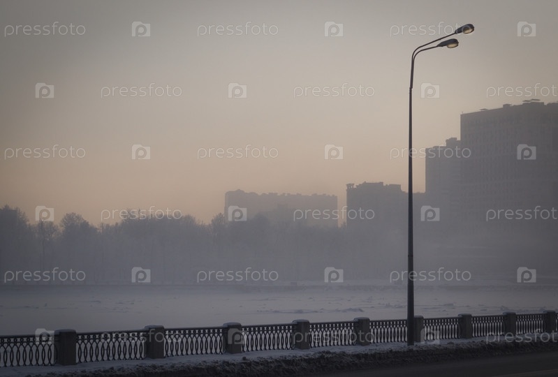 Уличный фонарь на закате зимним вечером. Река Наюрежная в Санкт-Петербурге
