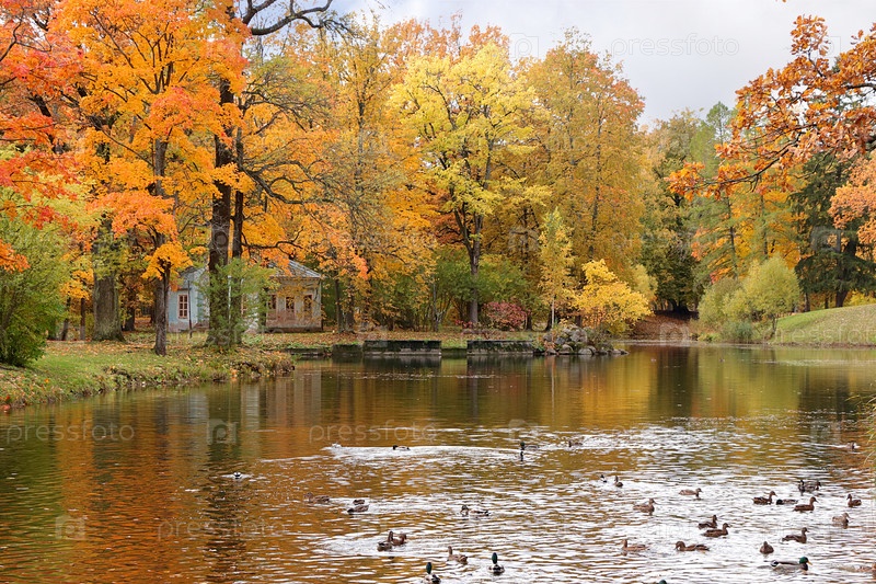 Золотой осенний сезон в России, фон. Осенний парк в октябре в солнечный день, озеро с красными кленовыми листьями и дубами. Красивый яркий природный ландшафт в парке, времена года, приглашение на прогулку, выборочный фокус