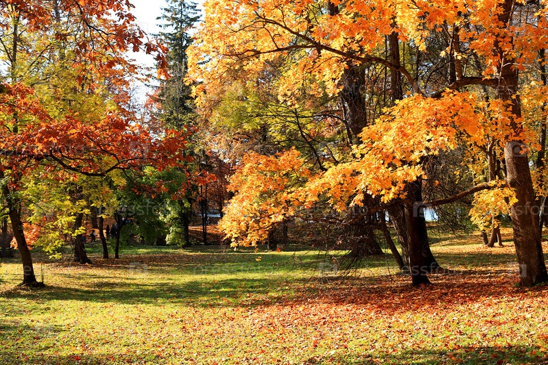 Золотой осенний сезон в России, фон. Осенний парк в октябре в солнечный день, озеро с красными кленовыми листьями и дубами. Красивый яркий природный ландшафт в парке, времена года, приглашение на прогулку, выборочный фокус