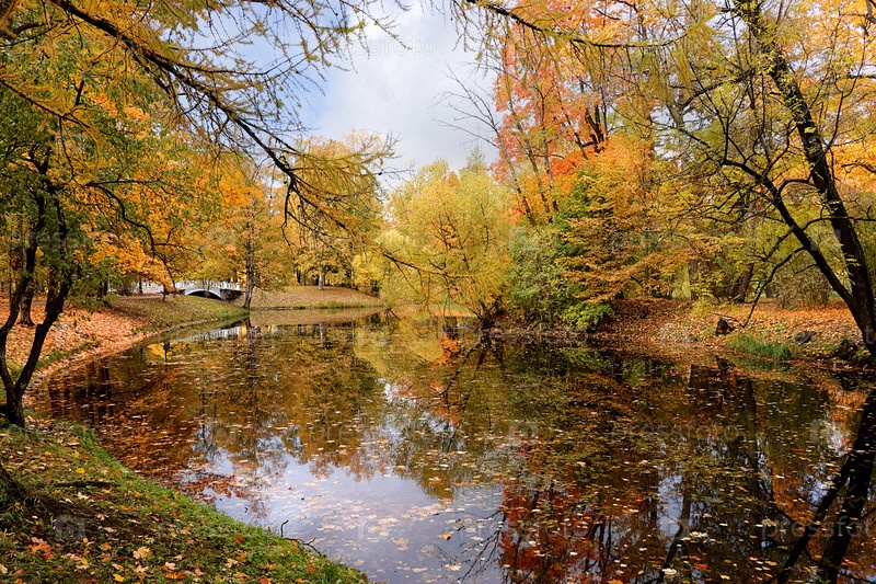 Золотой осенний сезон в России, фон. Осенний парк в октябре в солнечный день, озеро с красными кленовыми листьями и дубами. Красивый яркий природный ландшафт в парке, времена года, приглашение на прогулку, выборочный фокус