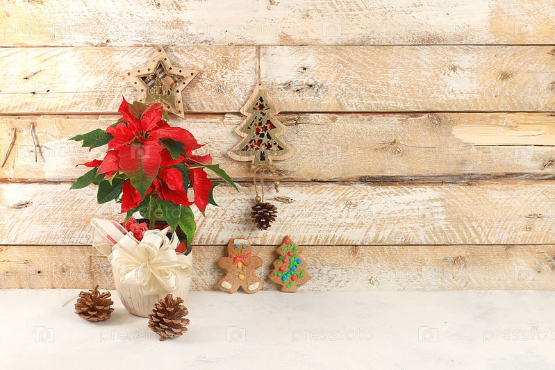 Пустой деревенский стол с пуансеттией, печеньем и самодельными деревянными украшениями, баннером для дизайна, фоном. Рождественский и новогодний макет для дизайна и демонстрации продукции, концепция нулевых отходов, избирательный фокус