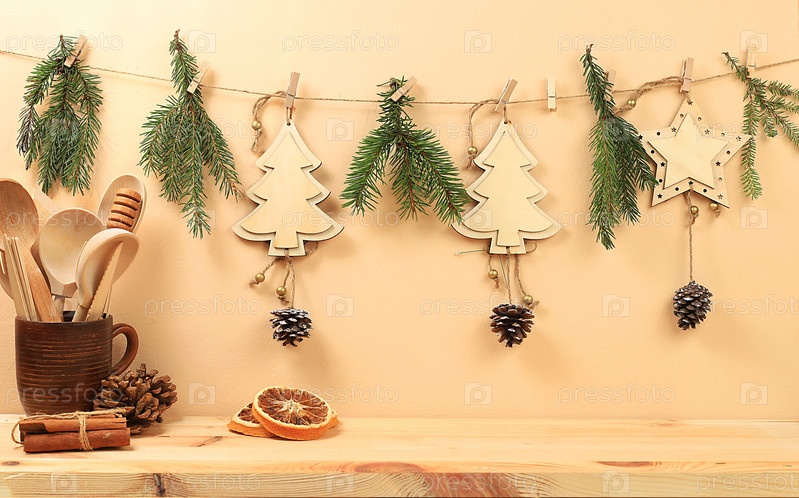 Пустой деревенский стол с живой елкой в кружке, сосновыми шишками, корицей и самодельными деревянными украшениями. Рождественский и новогодний эко-макет для дизайна и демонстрации продукции, концепция нулевых отходов, выборочный фокус