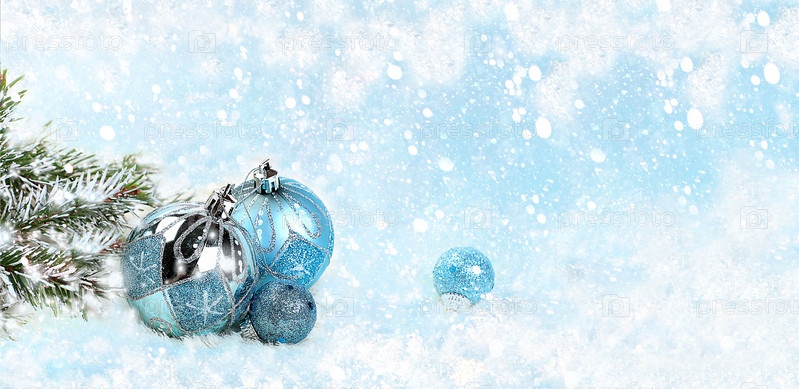 Рождество и Новый год 2024 фон с огнями и украшениями боке, игрушки с еловыми ветками в снежных хлопьях, баннер для праздничного экрана, шаблон для дизайна. Праздничная открытка, избирательный фокус,