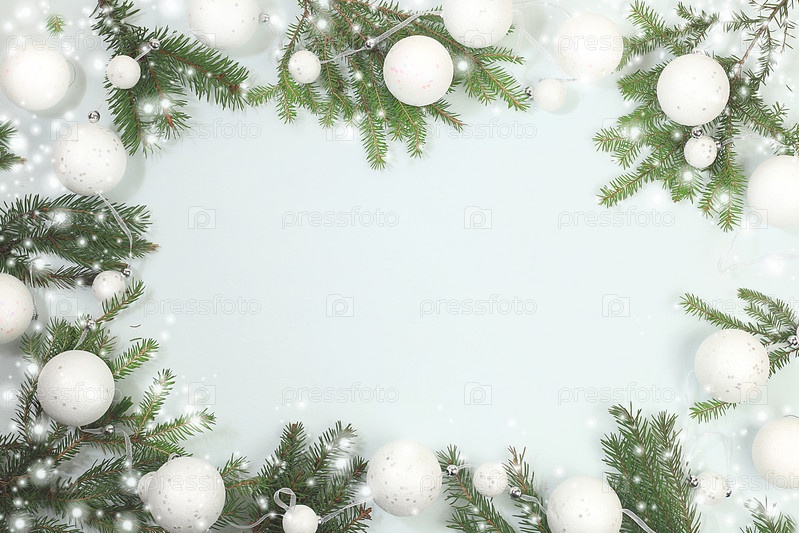 Рождество и Новый год 2024 фон с огнями и украшениями боке, игрушки с еловыми ветками в снежных хлопьях, баннер для праздничного экрана, шаблон для дизайна. Праздничная открытка, избирательный фокус,
