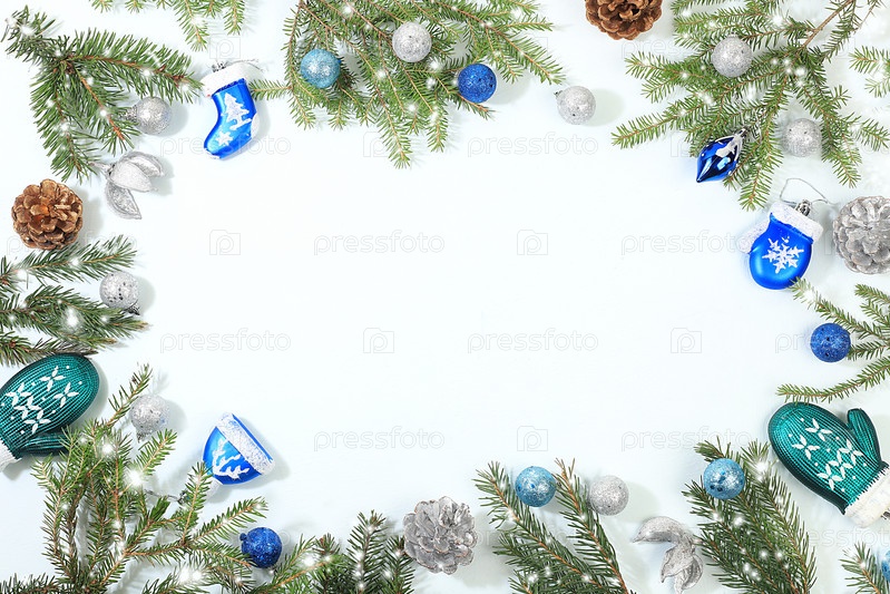 С Новым 2024 годом. Рождественские украшения, творческий фон с рождественскими украшениями, шары и еловые ветки с огнями и снегом, поздравительные открытки, баннер с местом для текста, выборочный фокус