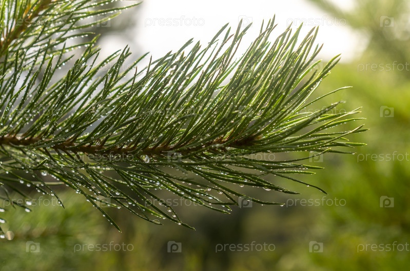 Сосновая ветка, освещенная солнцем с каплями дождевой воды