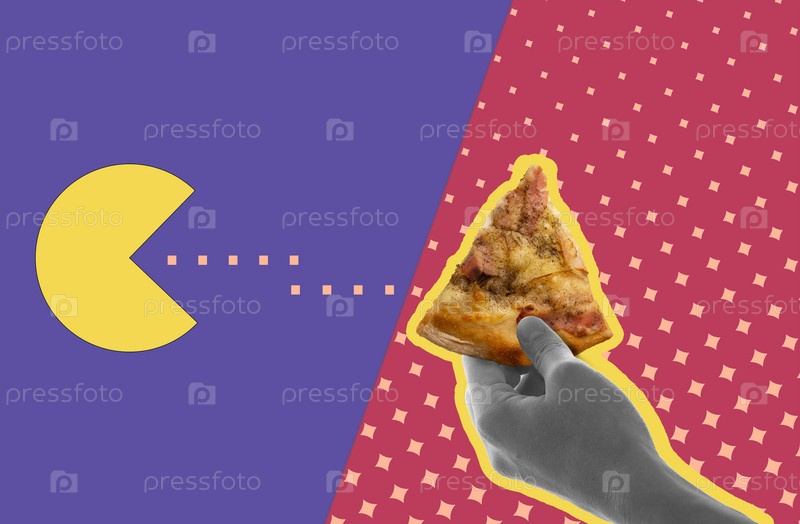 Рука держит кусок пиццы на розовом фоне. Пакман ест пиццу. Цифровой коллаж современного искусства