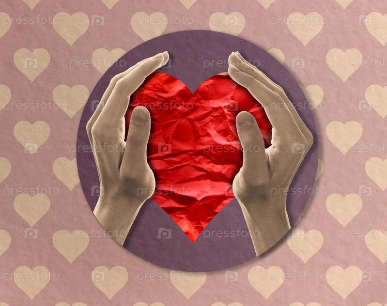 Руки держат бумажное сердце. Коллаж современного искусства в нежных розовых тонах. копипространство