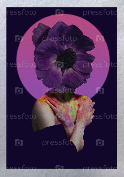 Женский портрет красоты с цветком вместо головы на темном фоне. Современный дизайн. Сюрреализм. Цветок анемоны