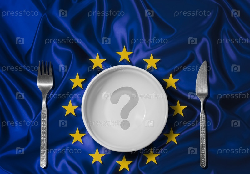 Пустая тарелка с вопросительным знаком на фоне флага Евросоюза. Глобальный кризис, проблема с продовольствием. Концептуальное послание, проблема голода и голода. Концепция голодной диеты