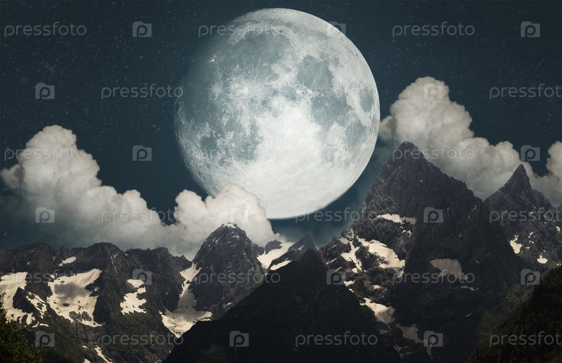 Луна и горы. Абстрактный ночной пейзаж. художественный коллаж