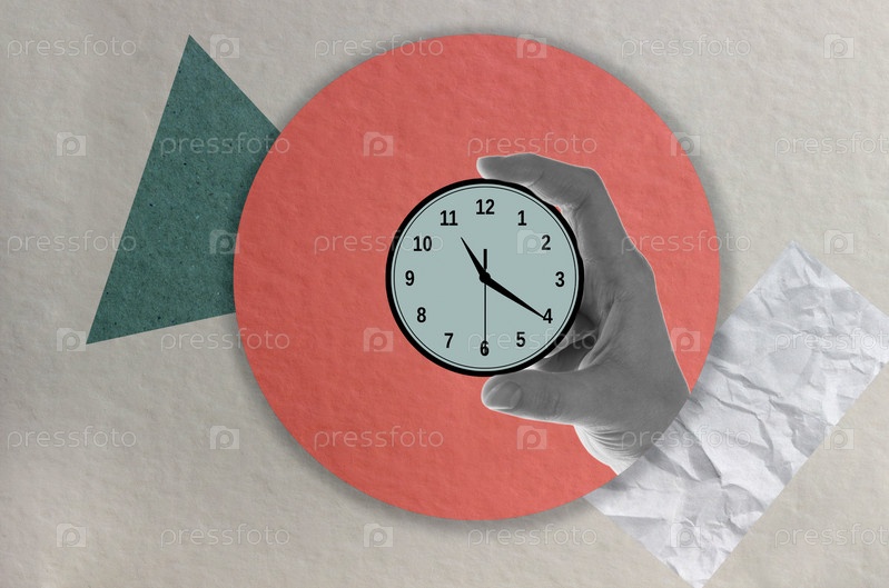 Руки держат часы. Коллаж современного искусства. копипространство