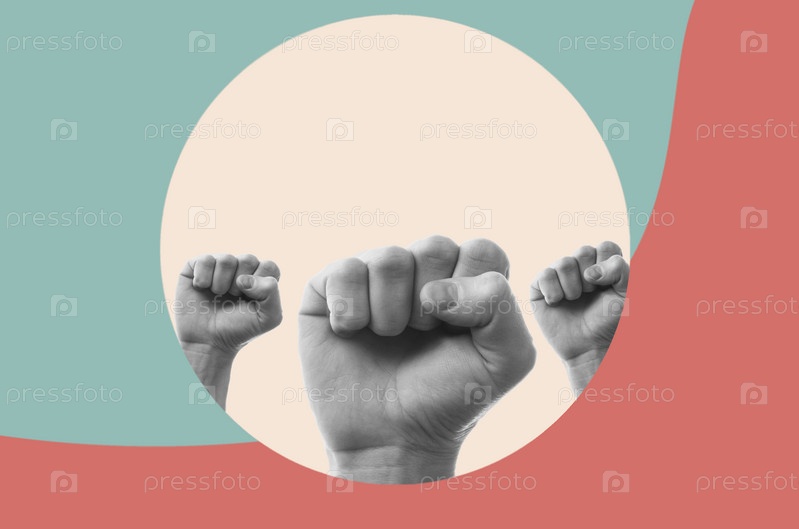Кулак женской руки. Коллаж современного искусства. Борьба за права человека. Борьба за права женщин