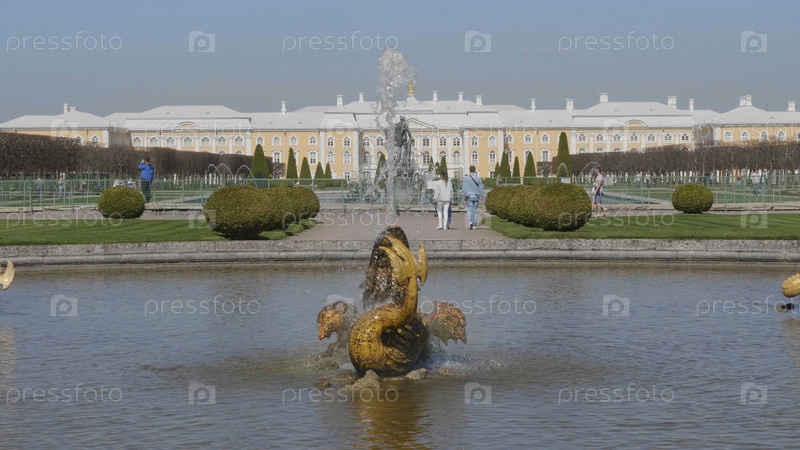 СТ. ПЕТЕРБУРГ, РОССИЯ, 12 мая 2018 года: Петергоф или Петергоф, известный как Петродворец с 1944 по 1997 год, и фонтан Нептуна 12 мая 2018 года в Санкт-Петербурге, Россия