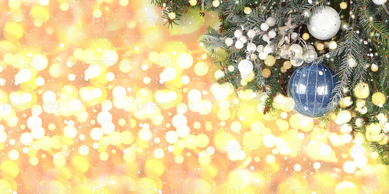 Рождество и Новый год 2024 фон с огнями и украшениями боке, игрушки с еловыми ветками в снежных хлопьях, баннер для праздничного экрана, шаблон для дизайна. Праздничная открытка, избирательный фокус,