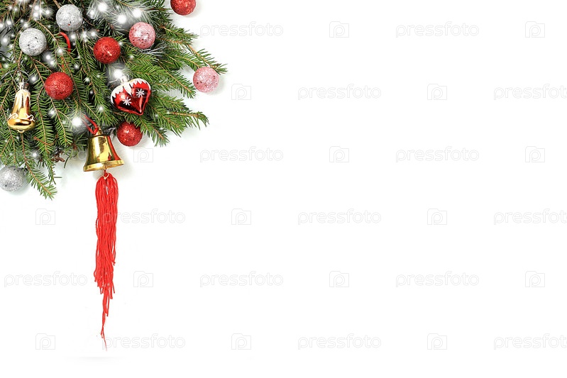С Новым 2023 годом. Рождественские украшения на белом фоне, шары и еловые ветки с огнями и снегом, поздравительные открытки, баннер для отображения с местом для текста, шаблон для дизайна, выборочный фокус